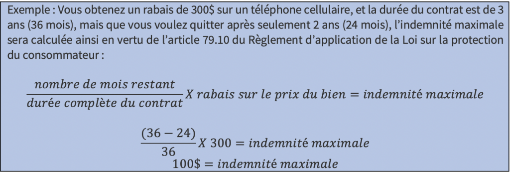 In a fixed-term contract, if the consumer has not received an economic benefit, the cost of termination may not exceed the lesser of $50 or a sum representing 10% of the price of the services provided for in the contract. However, if an economic benefit has been granted, for example, if the consumer has received goods at a reduced price, such as a telephone, section 79.10 of the Regulation respecting the application of the Consumer Protection Act provides that the maximum compensation is the number of months remaining in the contract/duration of the contract, multiplied by the discount on the price of the property.