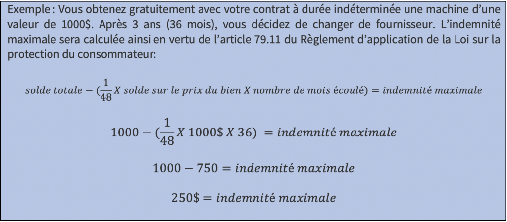 This would be the case, for example, with Netflix, which could not charge a cancellation fee if you wish to withdraw from your contract. If there is an economic benefit, section 79.11 of the Regulations under the Act provides that the cost of cancelling the contract must be at most the balance on the price of the property, less 1/48 of the balance on the sale price of the property, multiplied by the number of months elapsed in the contract. This means that after 4 years there can be no compensation. An interesting effect of this calculation is that if you have maintained your contract of indefinite duration for more than 4 years, then it is illegal for the service provider to charge you severance pay, even if it has provided you with an economic benefit.